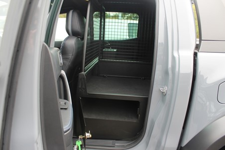 Bilen er udstyret med et specielt sikret hundebur bag forsæderne som er boltret fast. Yderligere et aflåst geværrum til rifler og et sikkerhedsrum til bundstykker og patroner.